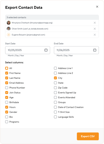 You can export your contact list to a CSV file, including the selected contacts, their start and end dates, and any chosen data columns.