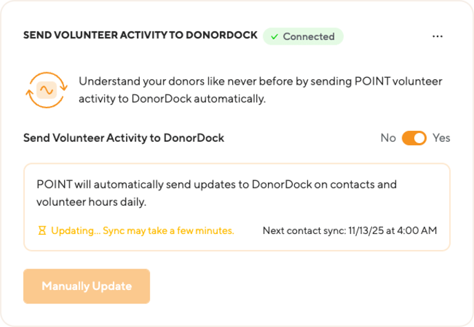 POINT automatically sends updates to DonorDock on contacts and volunteer hours daily.