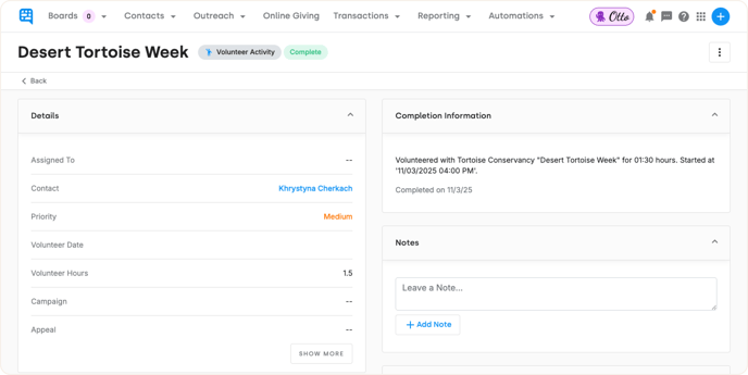 - Send Volunteer Activity data to DonorDock, which allows you to maintain a comprehensive record of volunteer engagement within the system.