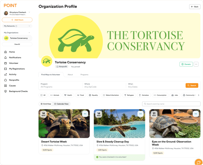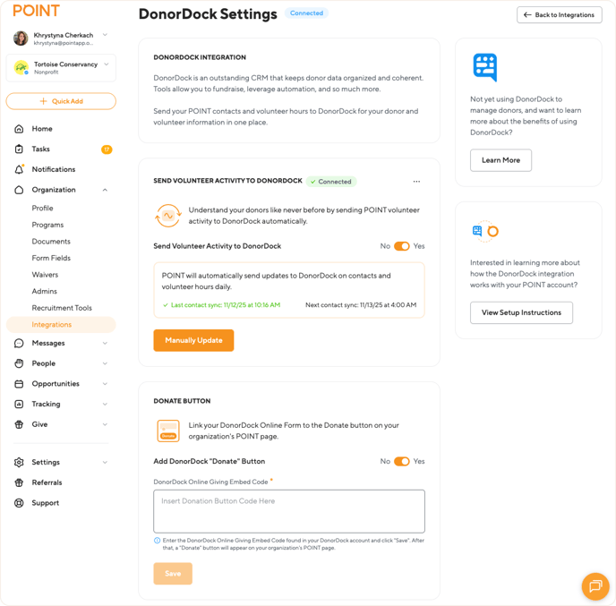 Send your POINT contacts and volunteer hours to DonorDock for your donor and volunteer information in one place. Also, add your "Donate" button to your organization's POINT page.