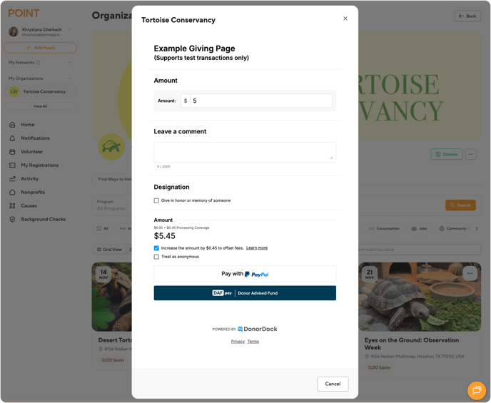 2. When a volunteer clicks the "Donate" button on your organization's POINT page, they are immediately directed to your designated DonorDock Online Giving page.