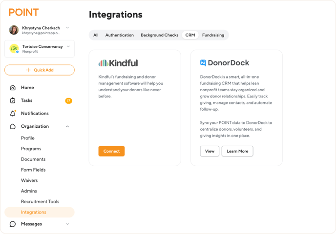 If not, sign up for a DonorDock account here! Then return to POINT to set up the integration.
