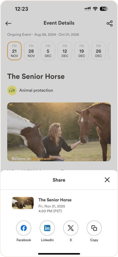 When viewing the platform in a desktop or mobile browser, the sharing options are located directly on the event details page.