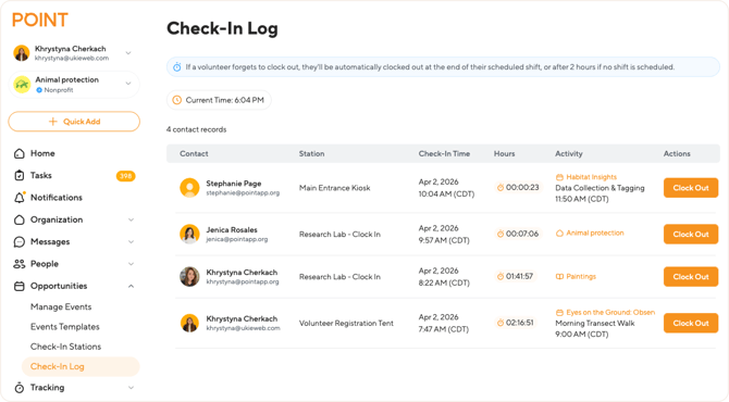 Previously, admins could only see volunteer hours after the volunteer had successfully clocked out. With the Check-In Log, you can see exactly who is clocked in right now, how long they've been volunteering, and even step in to manage their session if needed.