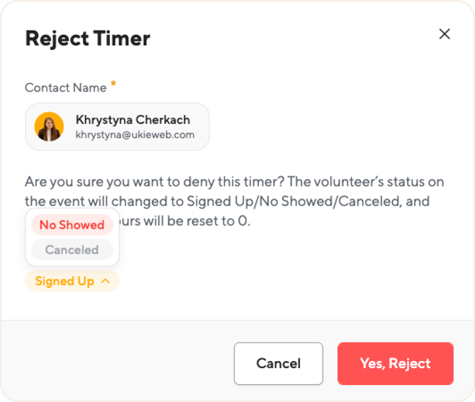 Because this timer is tied to a specific scheduled shift, rejecting the timer means you must also decide the volunteer's final attendance status for that shift.