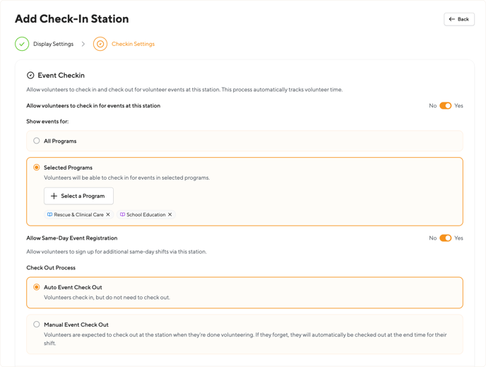 Allow volunteers to check in and check out for volunteer events at this station. This process automatically tracks volunteer time. This manages which events volunteers can check in for via this specific station.