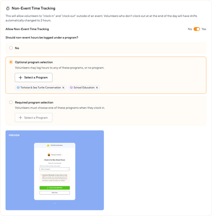 This section controls the core functionality of the station. You can enable Event Check-in, Non-Event Time Tracking, and Walk-ins/New Volunteer Registration individually or in various combinations.