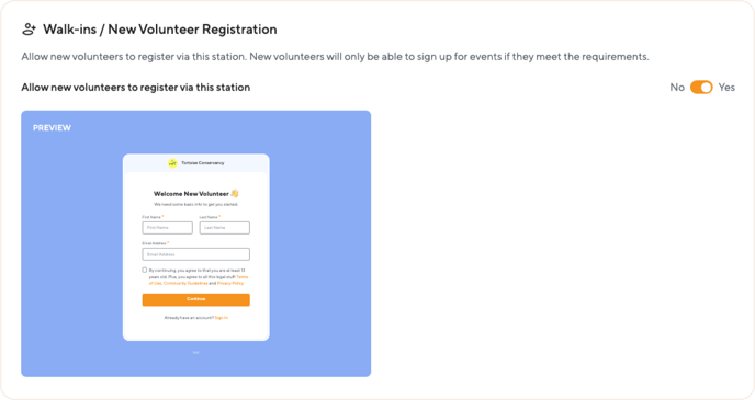 | Allow new volunteers to register via this station | Toggles the new volunteer registration form on (Yes). New volunteers will only be able to sign up for events if they meet the existing requirements. You can find the requirements here |