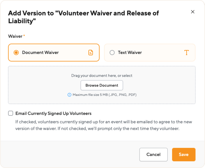 In the "Add Version" pop-up, choose whether your new version is a Document Waiver or a Text Waiver.