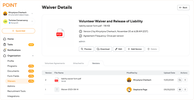 👉 Congratulations! The waiver version is now updated. Everywhere this waiver is attached (like specific events or applications), volunteers will now see and agree to this newest version upon their next interaction.