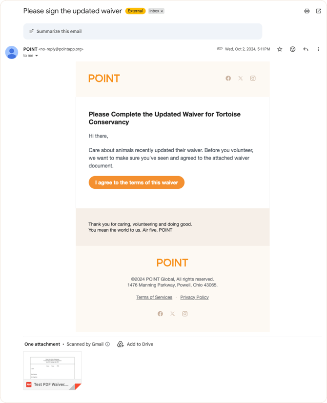 What volunteers see: They’ll receive an email with the subject line “Please sign the updated waiver” (see example below).