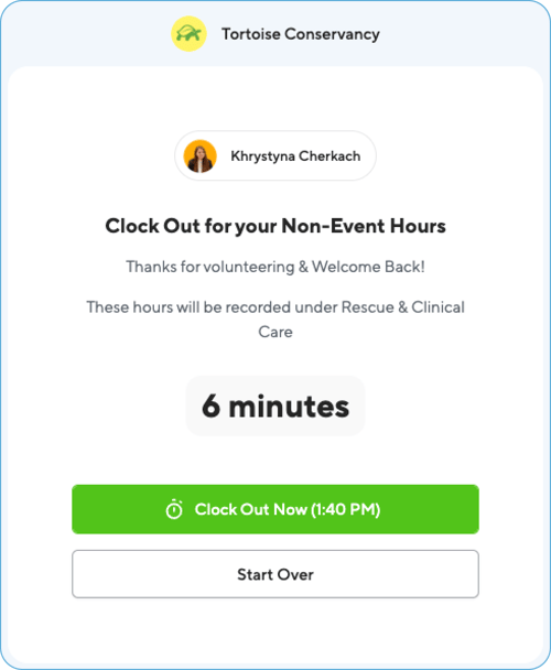 If your organization has enabled Non-Event Time Tracking on a Kiosk, you can easily log your volunteer hours outside of a scheduled event shift by using the "clock in" and "clock out" feature.