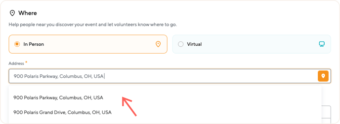 It is crucial to enter your event address correctly successful event publication. The Event Address is used as the primary criterion when the POINT system searches for events for volunteers.