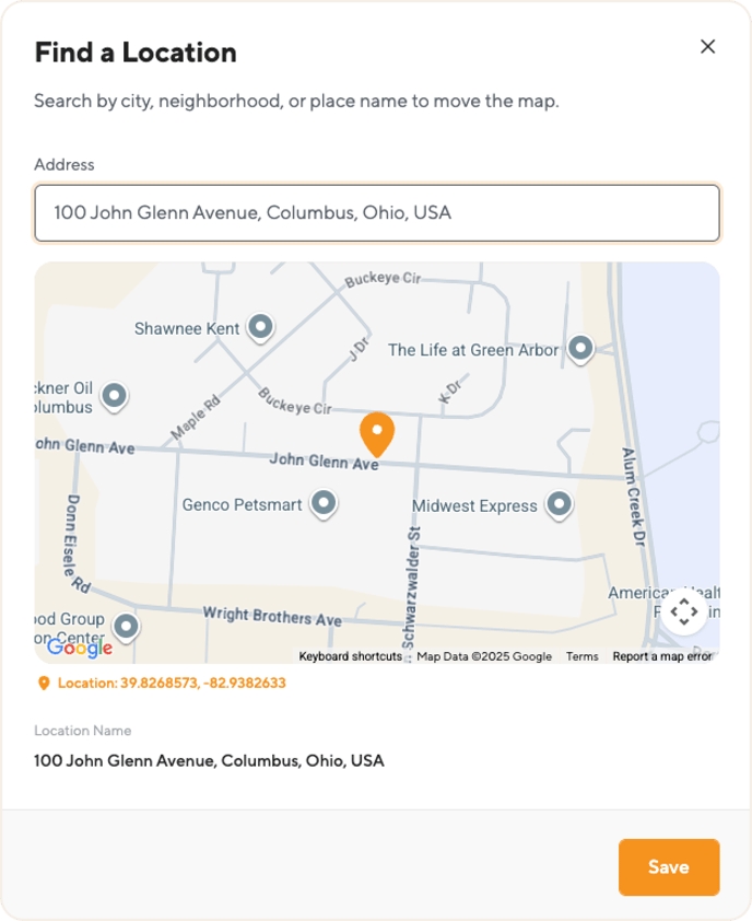 A pop-up window titled "Find a Location" with a map will appear.