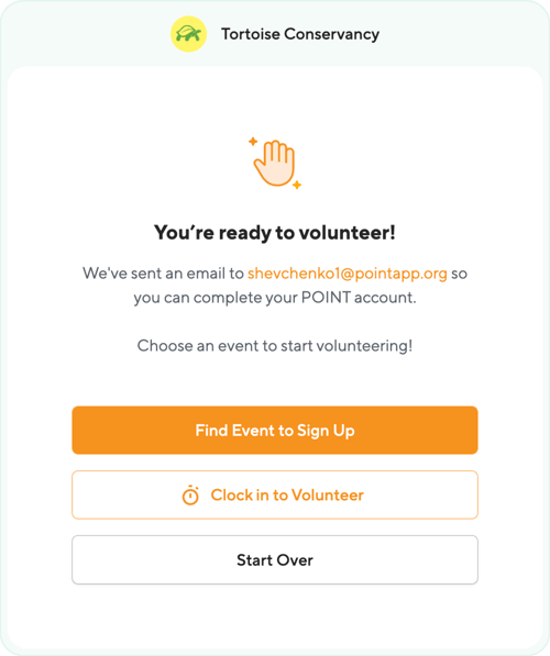 Your contact record is now created with the organization. Crucially, the system sends an invitation email to the email you provided. To fully manage your volunteer history and profile, you must use that email invitation to create your POINT account and claim your contact record.