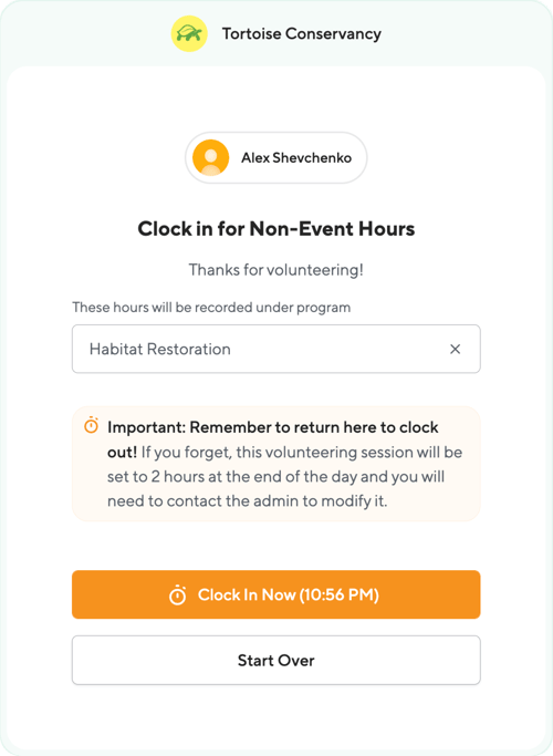 Non-Event Time Tracking: Allows you to "Clock In" and "Clock Out" for flexible hours outside a scheduled event.