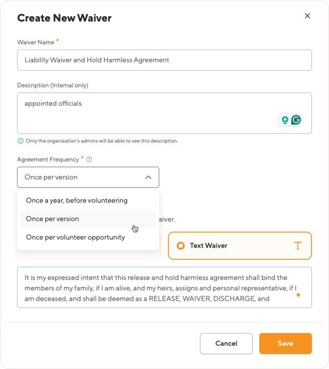 The agreement frequency determines how often a volunteer must agree to a specific waiver. This setting is initially configured during the creation of a waiver, but it can also be modified later if your organization's needs change.